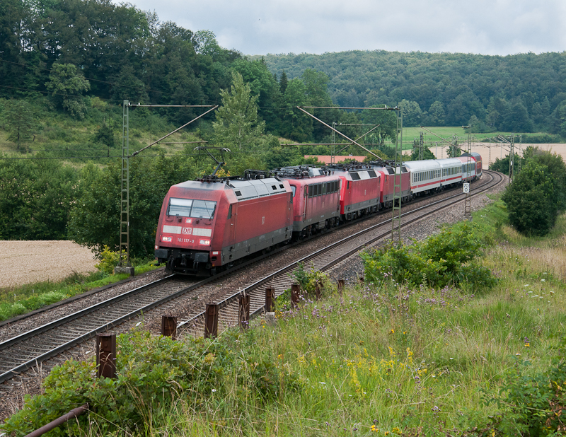 Am 28. Juli 2011 konnte ich bei Urspring diesen PbZ bestehend aus 101 117-0, einer 115, 2x 120, 2 IC Wagen, 1 ÖBB EC Wagen und einem Dosto aufnehmen.