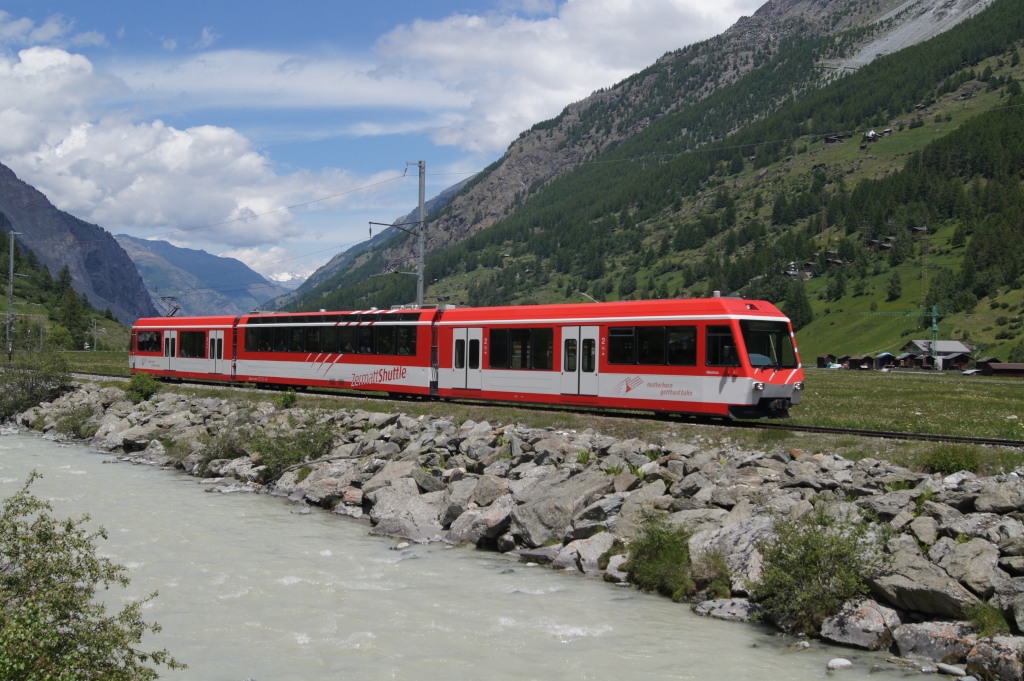 Am Nachmittag ging es für mich dann runter nach Täsch, vom Ufer der Matter Vispa noch ein paar Bilder zu schiessen. Als erstes kam mir der Zermatt-Shuttle BDSeh 4/8 2053 vor die Linse (12.6.11)