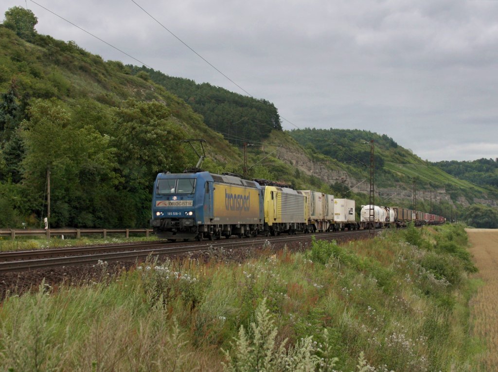 Die 185 518 und die ES 64 F4-009 am 30.07.2011 mit einem KLV-Zug unterwegs bei Karlstadt.