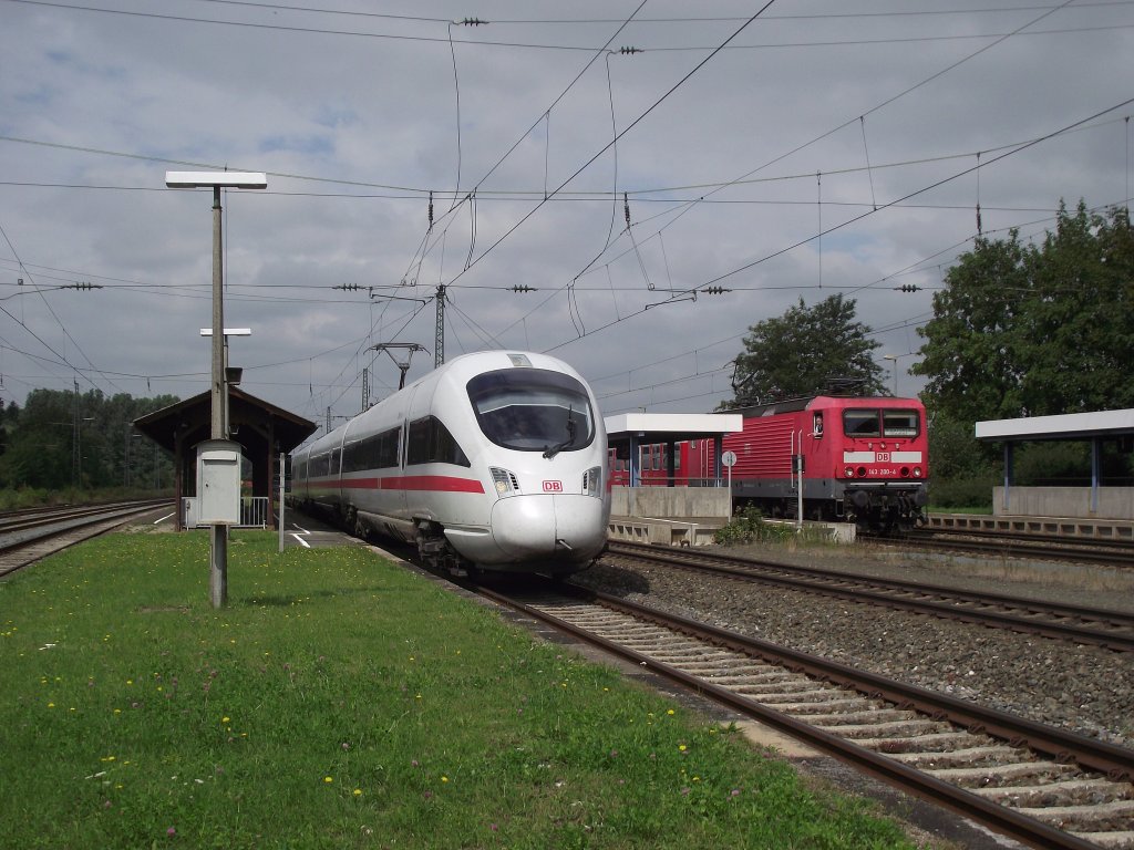 Ein 411er durchfährt am 1. August 2011 auf seiner Fahrt nach Berlin den Bahnhof Hochstadt-Marktzeuln über Gleis 4.