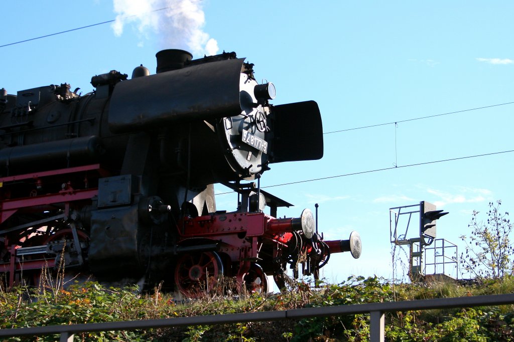 Mal ein etwas seltenerer Blickwinkel. 52 8177 verläßt am 09.10.2010 den Bf. Freital-Hainsberg, nachdem sie einen Sonderzug des Traditionszug Berlin e.V. dorthin gebracht hatte. Die Aufnahme erfolgte vom daruntergelegenen Bahnsteig der Weißeritztalbahn aus.