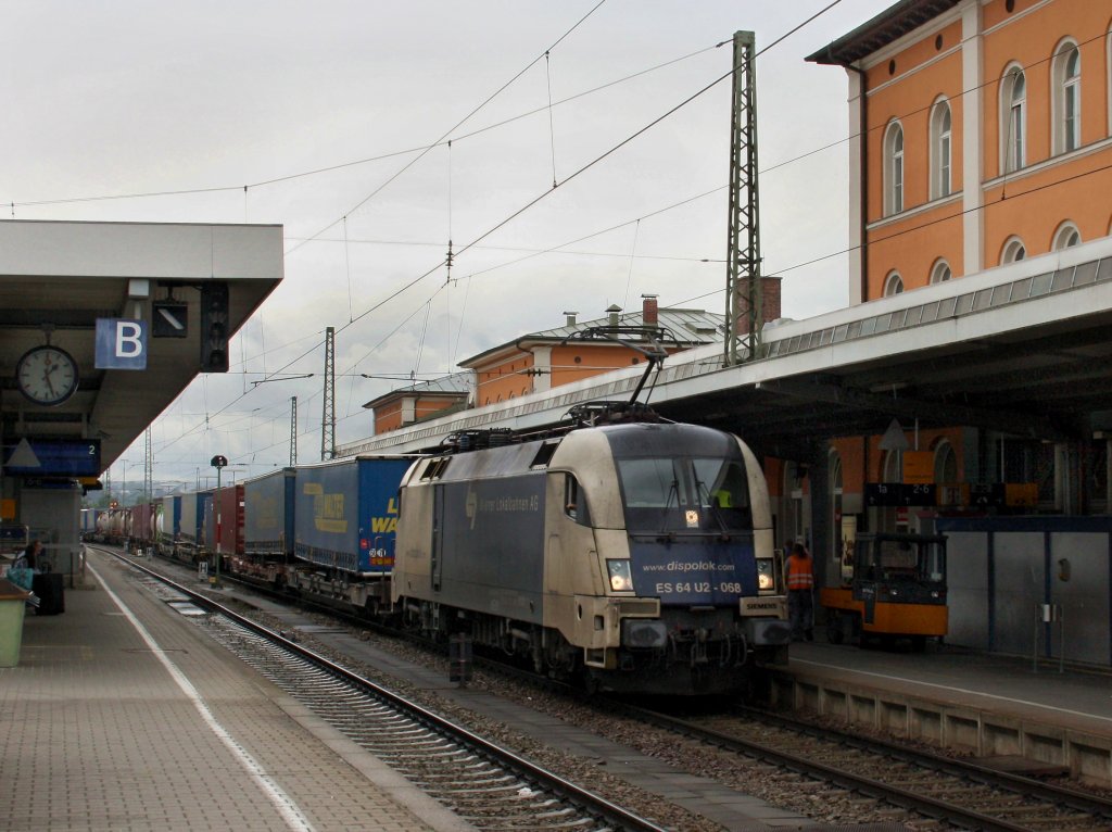 Die ES 64 U2-068 am 07.08.2011 mit einem KLV-Zug bei der Durchfahrt durch den Passauer Hbf.