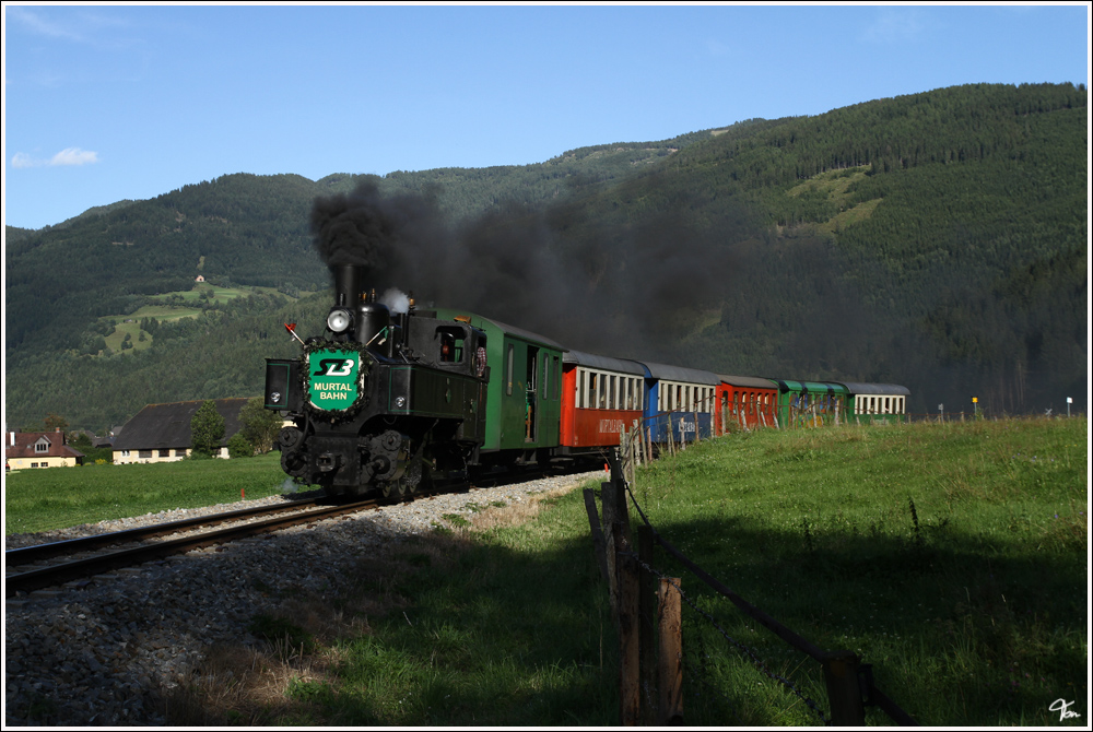 STLB Dampflok BH1 fährt mit dem Dampfbummelzug von Murau nach Tamsweg. Stadl an der Mur 10.8.2011