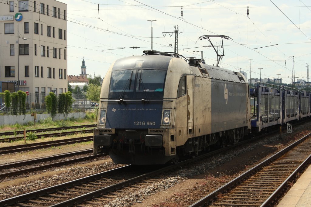 1216 950 der "Wiener Lokalbahn" mit ihrem leeren Autozug hier zu sehen in Regensburg Hbf am 24.05.2011