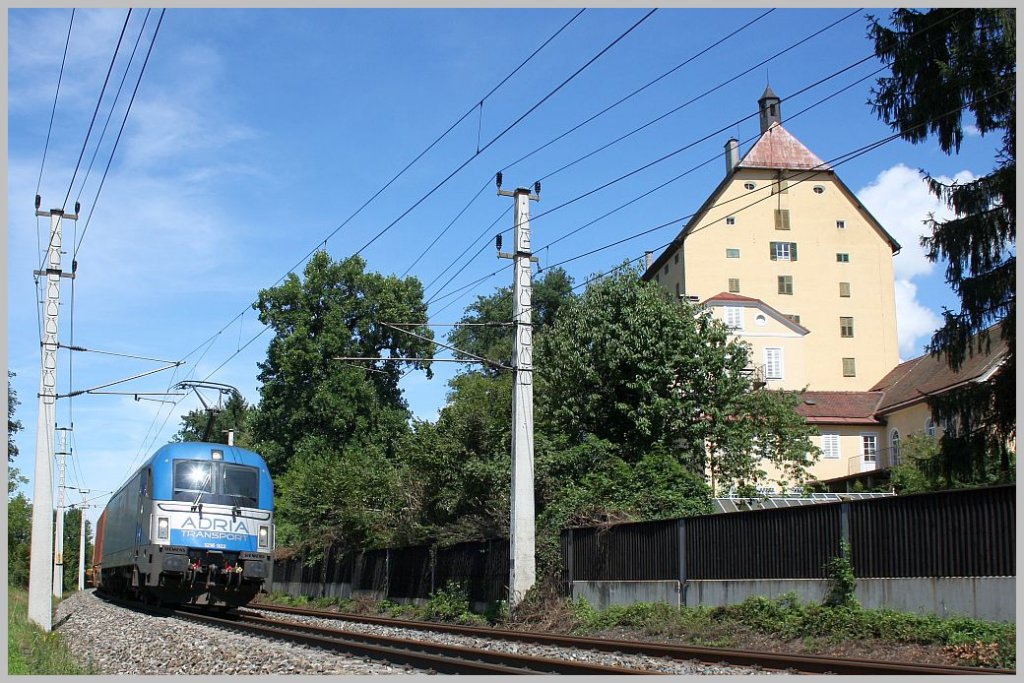 Adria Transport 1216 922 fährt im Auftrag der SLB den SLB-Kaindlzug 61823(für das Holzunternehmen Kaindl) von Salzburg Liefering nach Hüttau. Schloss Goldenstein/Elsbethen, 06.08.11