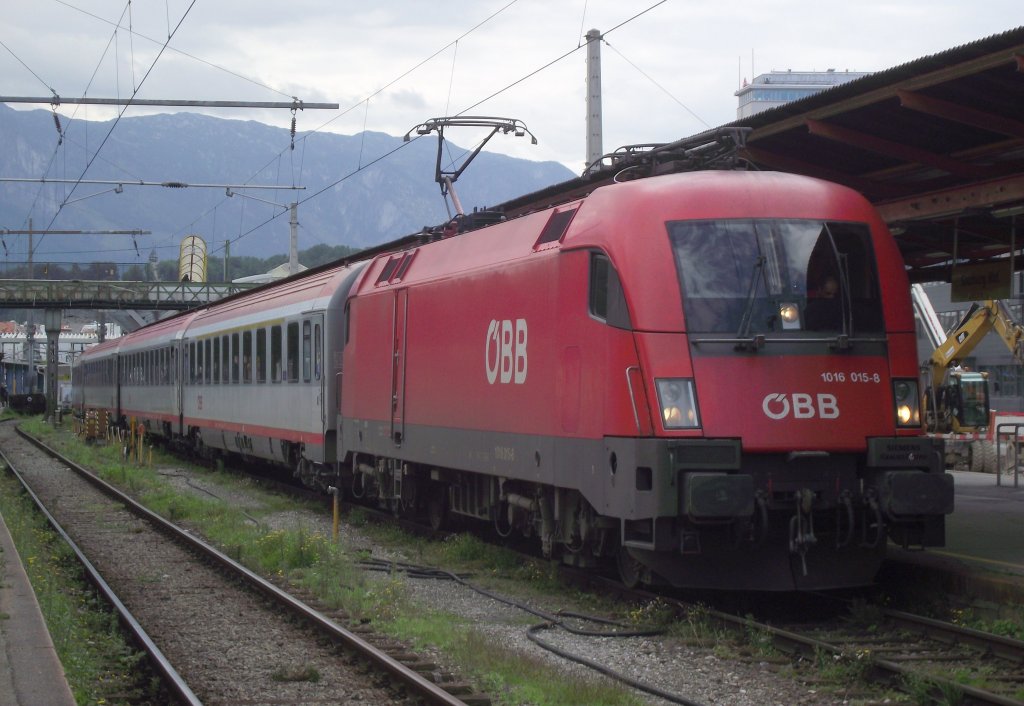 1016 015-8 steht am 10. August 2011 mit OIC 843	nach Wien Westbahnhof im Salzburger Hbf.