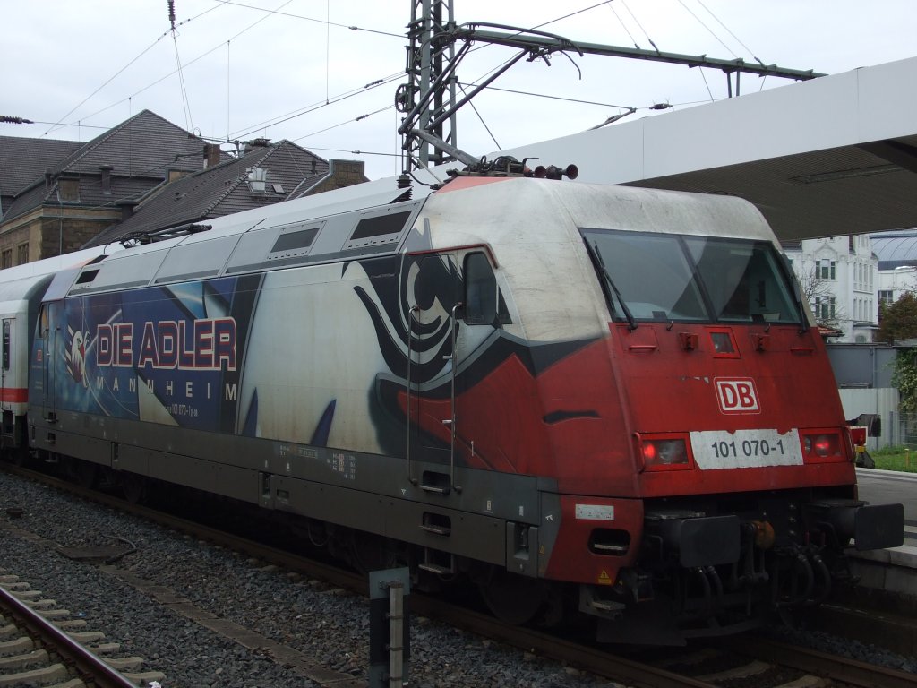 Am 16.08.2011 schob 101 070-1 ihren InterCity nach Herford, hier beim Halt in Bielefeld.