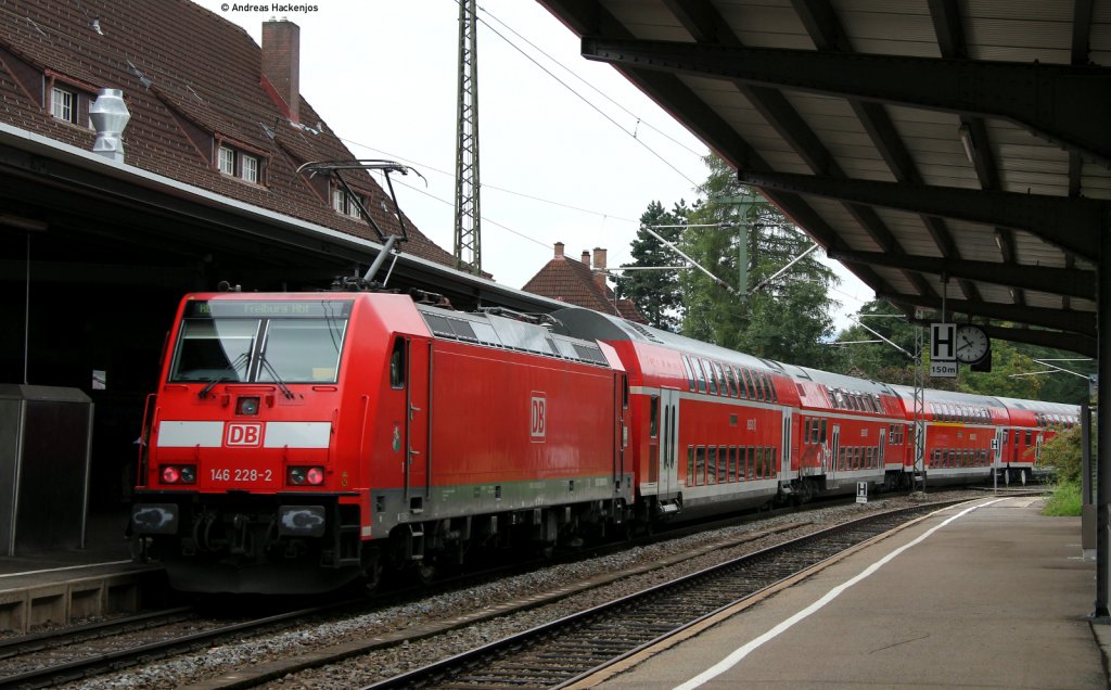 Wegen eines Schadens ist die Höchstgeschwindigkeit von 146 228-2 seit ihr ein paar Wochen auf 120 km/h beschränkt und somit wird sie von Freiburg aus, zu meist ins Höllental oder im Rheintal eingesetzt. Hier schiebt sie gerade die RB 26926 (Neustadt(Schwarzw)-Freiburg(Breisgau) Hbf) aus Titisee 30.7.11