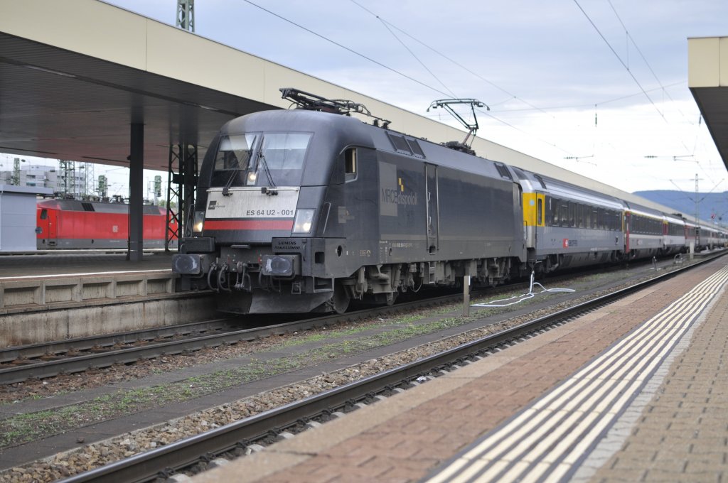 Die MRCE Dispolok ES 64 U2-001/182 501-7 D-Dispo mit IC nach Stuttgart hier bei Einfahrt von Basel Bad am 06.08 2011.