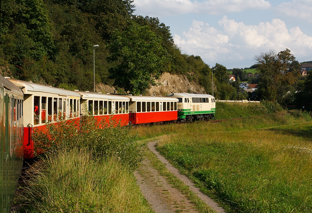 Ein herrlicher Familenausflug bei super Wetter: Mit der Brohltalbahn und der Diesellok D5 (ex FEVE 1405) am 18.08.2011 auf Rückfahrt (Bergab) hier kurz vor Burgbrohl. Die Brohltalbahn, mit einer landschaftlich reizvolle Bahnstreckelänge von 17,5 km, gehört zu den steilsten Adhäsionsstrecken mit 1000 mm Spurweite in Deutschland .