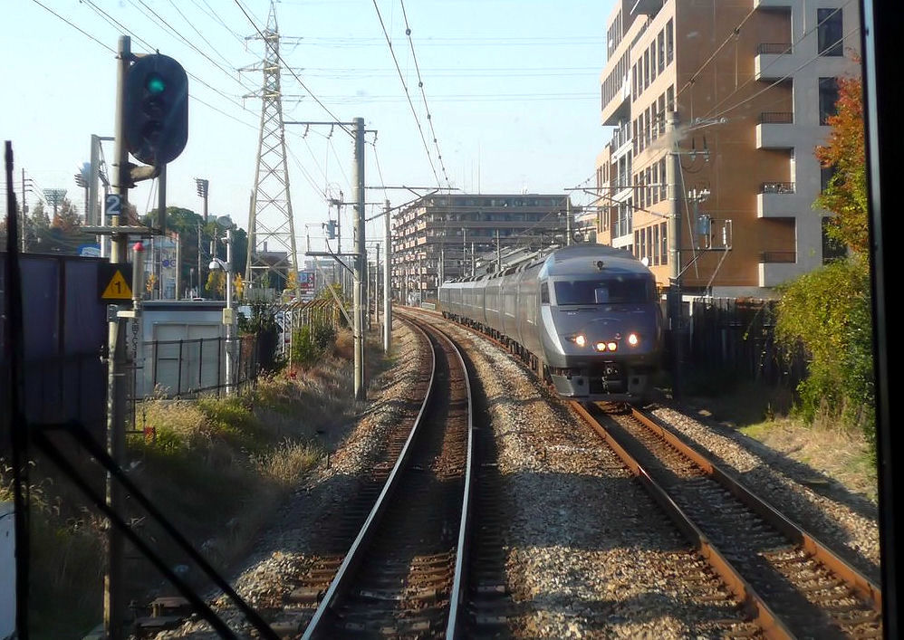 Serie 787: Wechselstromzug für die Südinsel Kyûshû, 20kV/60Hz. Insgesamt 140 Wagen gebaut 1992-2002 für die wichtige Nord-Süd-Verbindung entlang der Westküste. Anstrich in einem ruhigen, bräunlichen Grau. Lange Zeit 7- und 4-Wagenzüge; heute 6- und 4-Wagenzüge. Die Nord-Süd-Verbindung an der Westküste von Kyûshû ist jetzt eine Shinkansen-Strecke. Im Bild kreuzt ein 7-Wagenzug, geführt vom Motorwagen KUMORO 787-4, bei Ônojô im Einzugsgebiet der Grossstadt Fukuoka, 1.Dezember 2010. (KU =mit Führerstand, MO =motorisiert, RO =Luxussitzplätze)(Aufnahme durch die verglaste Führerstandrückwand eines Gegenzugs) KAGOSHIMA HAUPTLINIE (NORD)