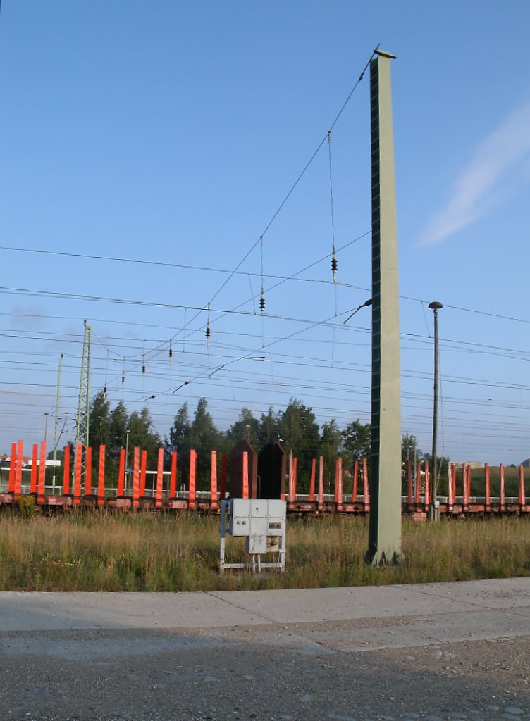 Abspannmast auf dem Einfahrgleis in Bergen/Rügen am 13.August 2011.
