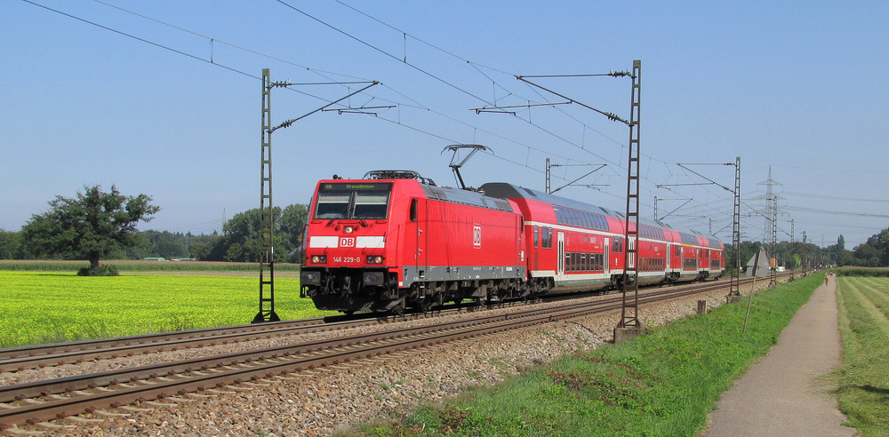 146 229-0 kommt hier mit dem IRE von Karlsruhe nach Kreuzlingen durch Ettlingen West gefahren. 20.08.2011