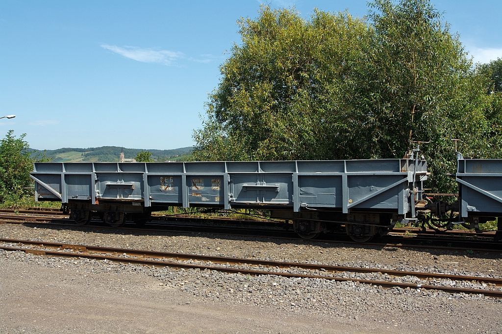 Schmalspur-Containerwagen (1000 mm)der Brohltal Eisenbahn (BE) Nr. 605 (S4kk), ex. FEVE 0.033, am 18.08.2011 in Brohl-Lützing auf der Gleisanlage.