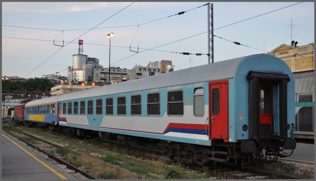 Etwas verloren wirkt der Bulgarische Schlafwagen aus Wien im Bahnhof von Belgrad. Aufgrund einer Verpätung war der Zug an den dieser Kurswagen nach Sofia eigentlich hätte angehängt werden sollen schon weg und der Wagen hat den Tag in Belgrad verbracht um abends nach Sofia zu fahren. Der Wagen wurde vor über 40 Jahren bei VEB Waggonbau Görlitz gebaut und dürfte nur noch Schrottwert haben.