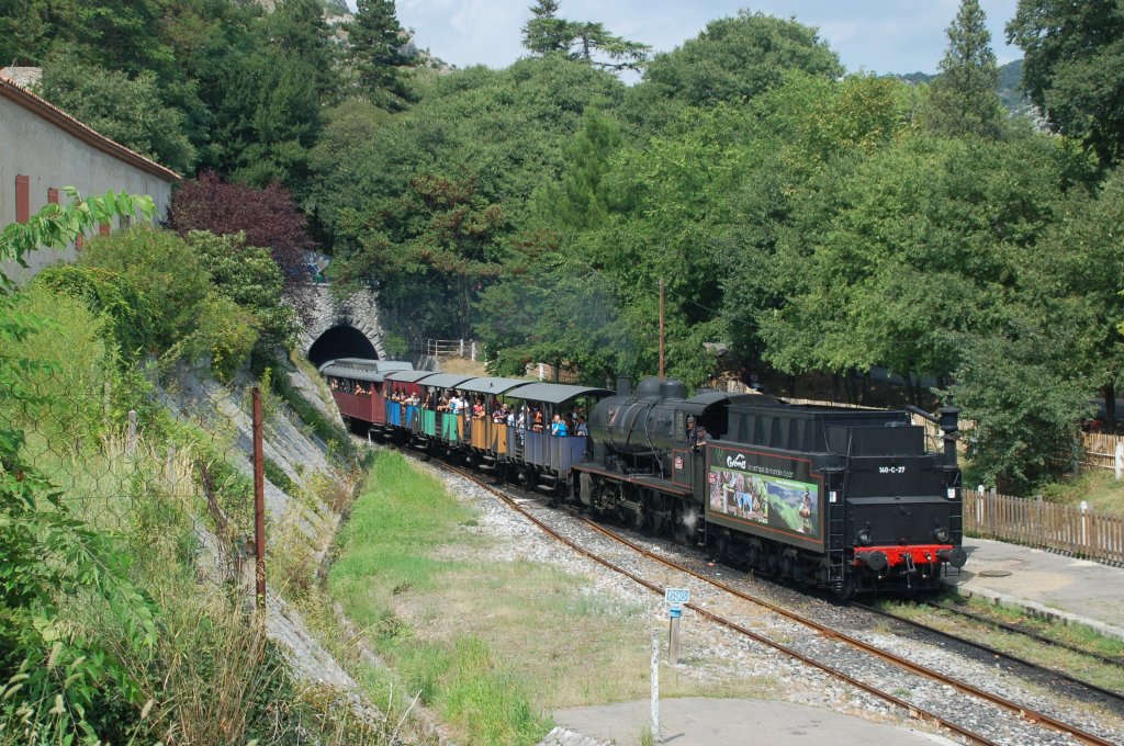 Die historische Lokomotive 140 C 27 von dem Dampfzug der Cevennen (Train à vapeur des Cévennes) fährt kurz vor dem Bahnhof Anduze aus dem Tunnel. Die Lokomotive ist nach jahrelanger Restaurierung wieder in Betrieb. 24.08.2011.