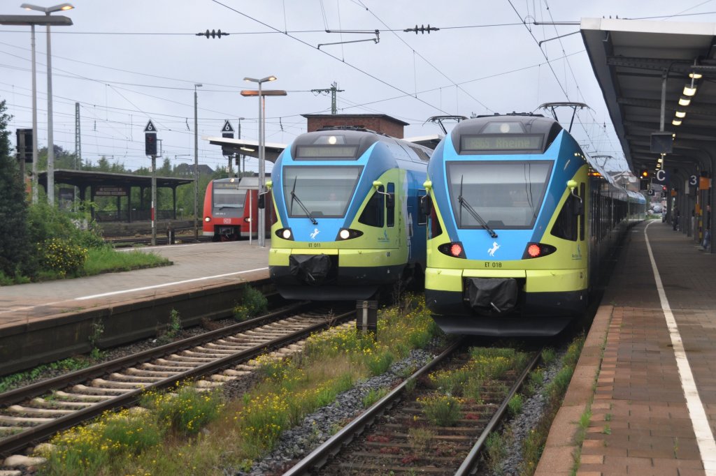 RHEINE (Kreis Steinfurt), 19.08.2011, Hochbetrieb im Bahnhof: rechts ET018 in Doppeltraktion mit ET009 als RB 65 von Münster/Westf. Hbf, daneben ET011 (ebenfalls Westfalenbahn) als RB 61 nach Bielefeld Hbf