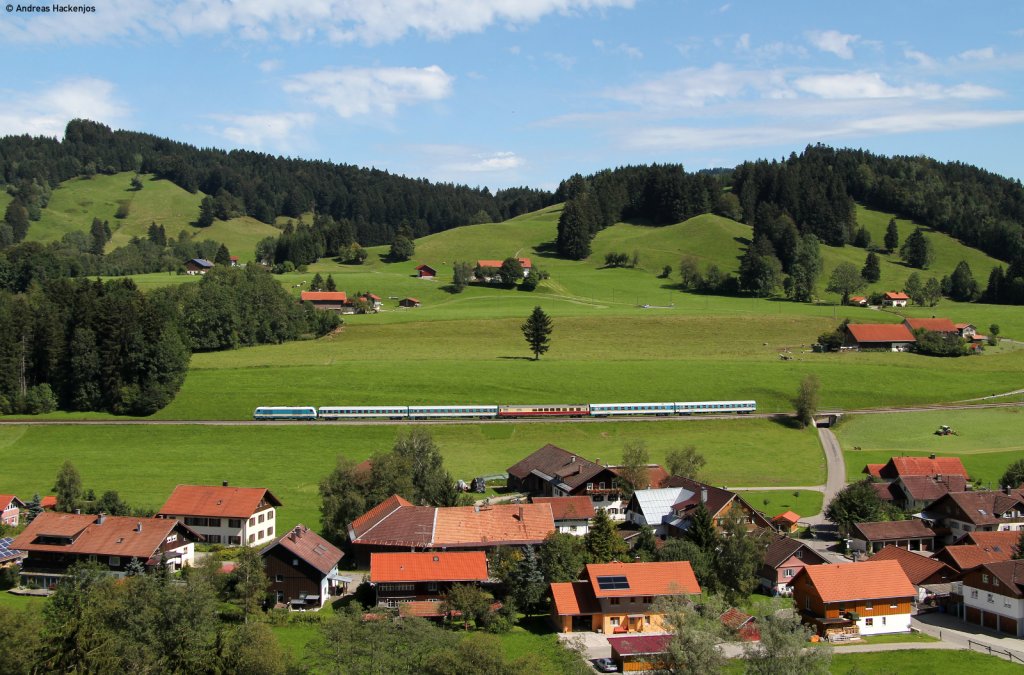 Eine 218 mit n-Wagen am 10.08.2011 bei Biessenhofen.