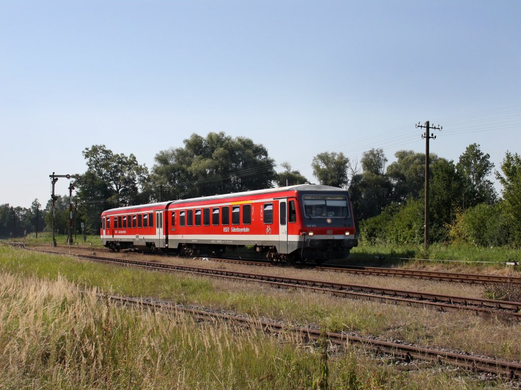 Der 628 575 als RB nach Passau am 26.08.2011 bei der Einfahrt in Karpfham.