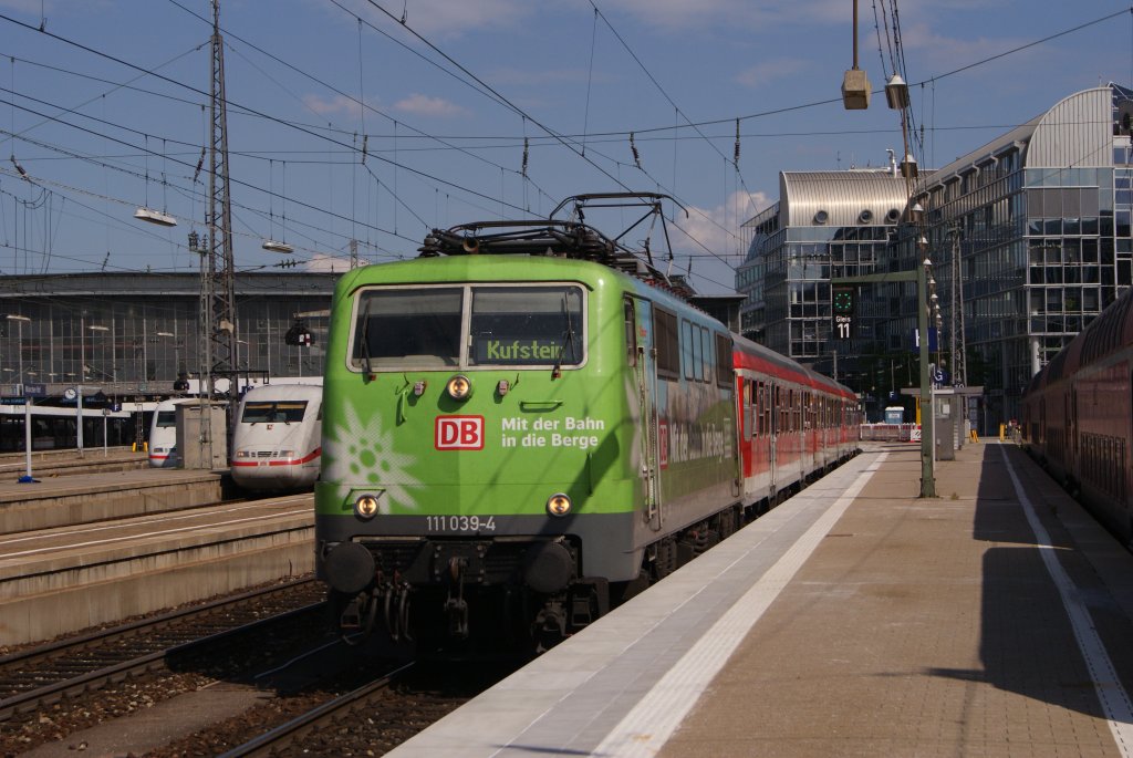 111 039-4 "Mit der Bahn in die Berge" zieht am 27.07.2011 den RE 79077 nach Kufstein.Hier bei der Ausfahrt aus München Hbf