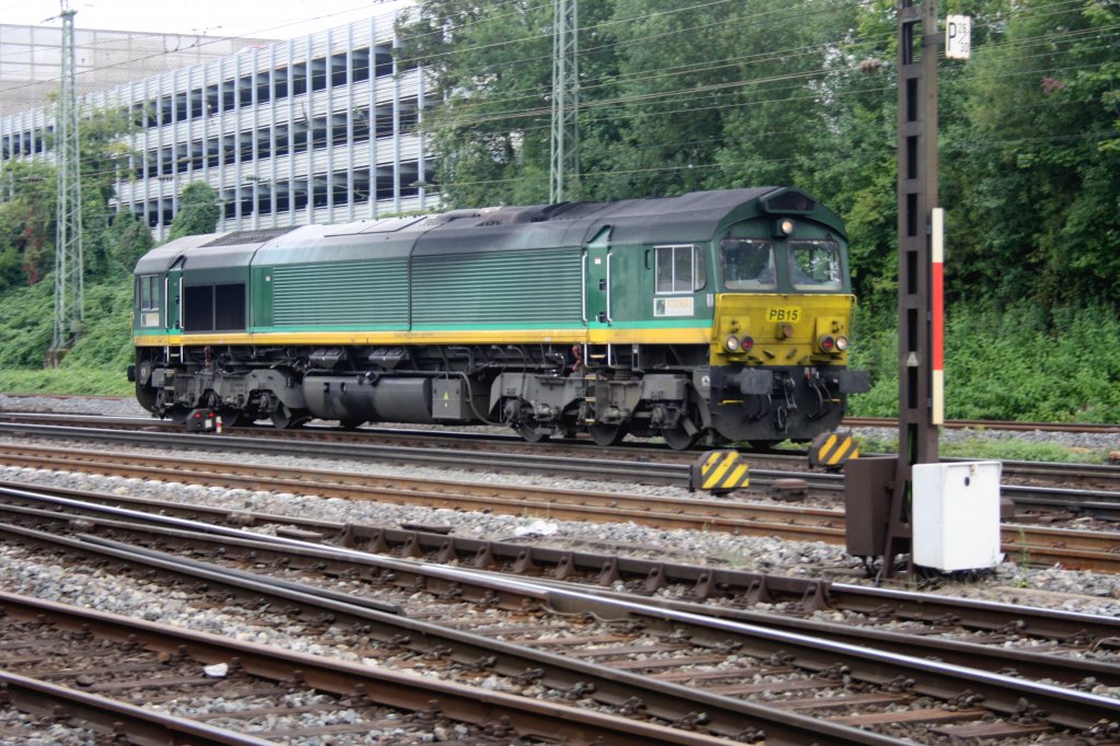 Die Class 66 PB15 von Ascendos Rail Leasing fährt mit einem Containerzug mit viel Gas von Aachen-West nach Belgien bei Wolken. 4.8.2011