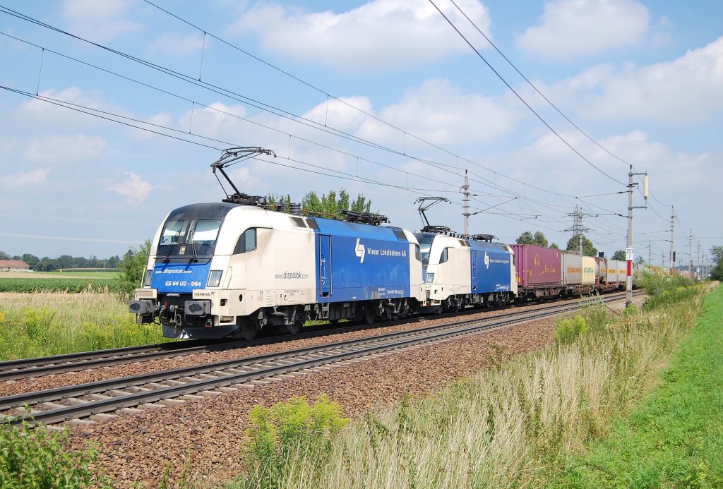 Mit einem Containerzug sind am 06.08.2011 die beiden WLB Fahrzeuge ES 64 U2-064 und ES 64 U2-066 nahe Marchtrenk zu sehen gewesen.