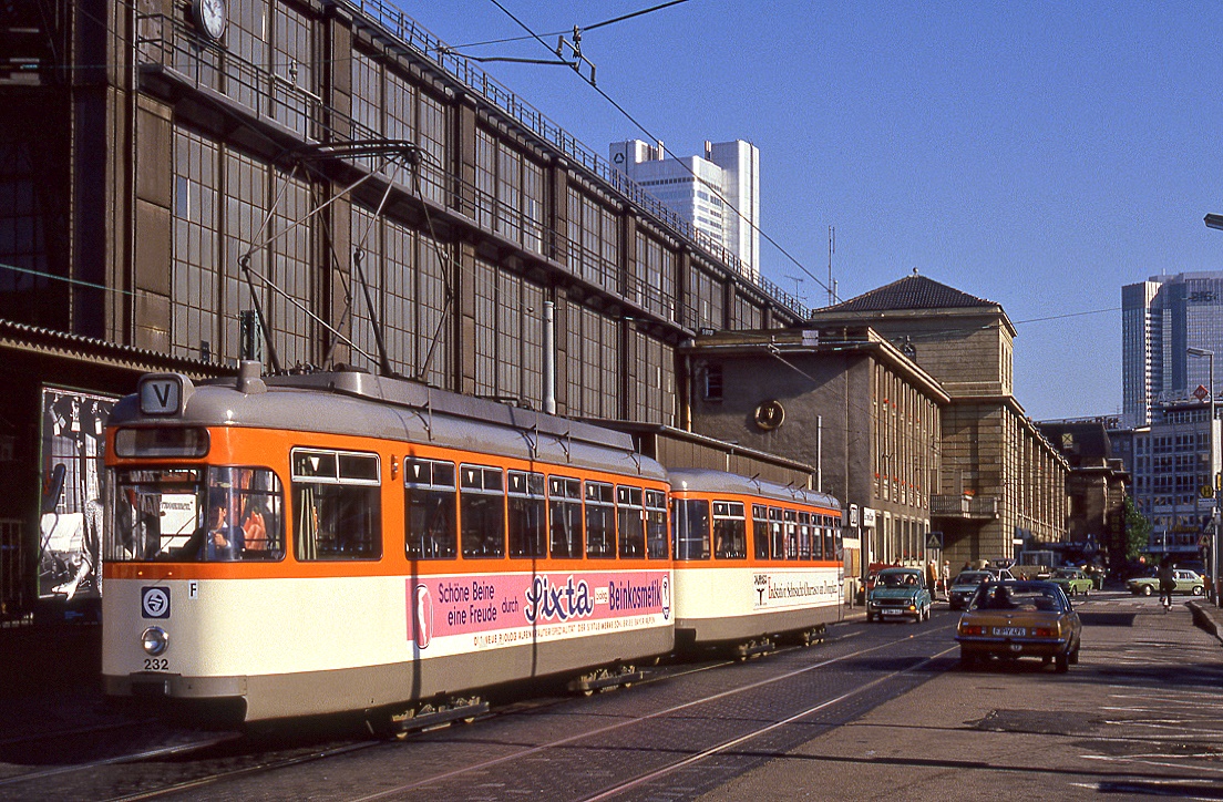Frankfurt Tw 232 mit Bw 1239 als Verstärker-Zug während der Buchmesse. Aufnahme in der Mannheimer Straße südlich des Hauptbahnhofs, 10.10.1987.
