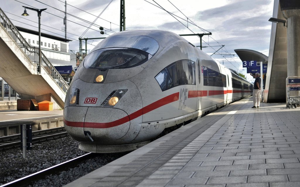 Auch bei der großen Bahn sind Zweiseitenaufnahmen möglich, auch wenn die Gleisradien wesentlich größer sind als bei der Straßenbahn. Ein IC auf der Fahrt von Ulm nach Stuttgart zwischen Lonsee und Urspring auf der Schwäbischen Alb.