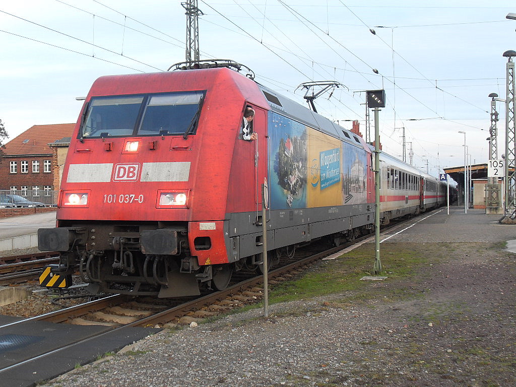 Auf Grund eines im Bahnhof Stendal abgestellten ICE 2(402 026)musste 101 037 mit IC 142 auf Gleis 2 Einfahren.