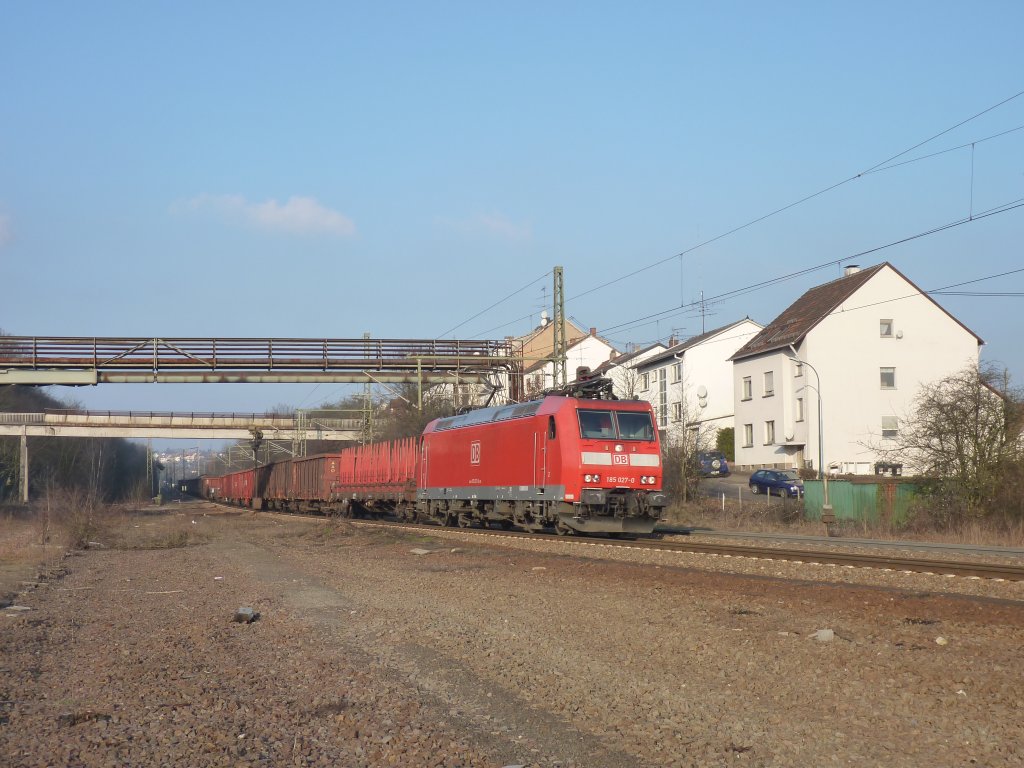 185 027 erreicht am kalten Wintermorgen des 29.1.11 mit ihrem gemischten Güterzug gleich den Bahnhof Neunkirchen/Saar.