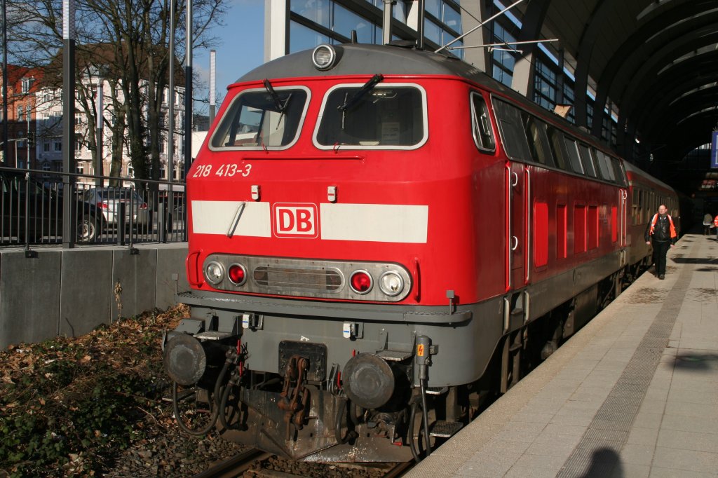 28.01.2011 Kiel Hbf 218 413-3 der Regionalbahn Schleswig-Holstein vor einem n-Wagen-Zug auf dem Weg von Kiel Hbf. nach Flensburg Hbf. Die 413-3 war längere Zeit zur Reparatur in Bremen und ist erst vor kurzem "nach Hause" zurückgekehrt.