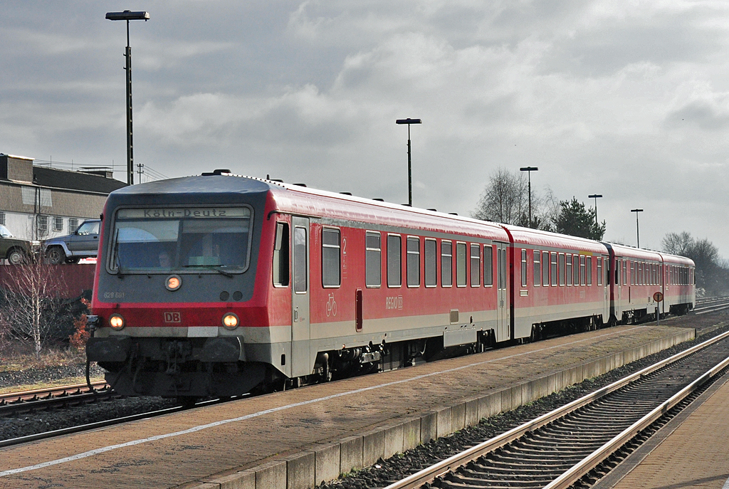 628 681 und 928 519 nach Köln-Deutz bei der Durchfahrt Bf Derkum - 26.01.2011