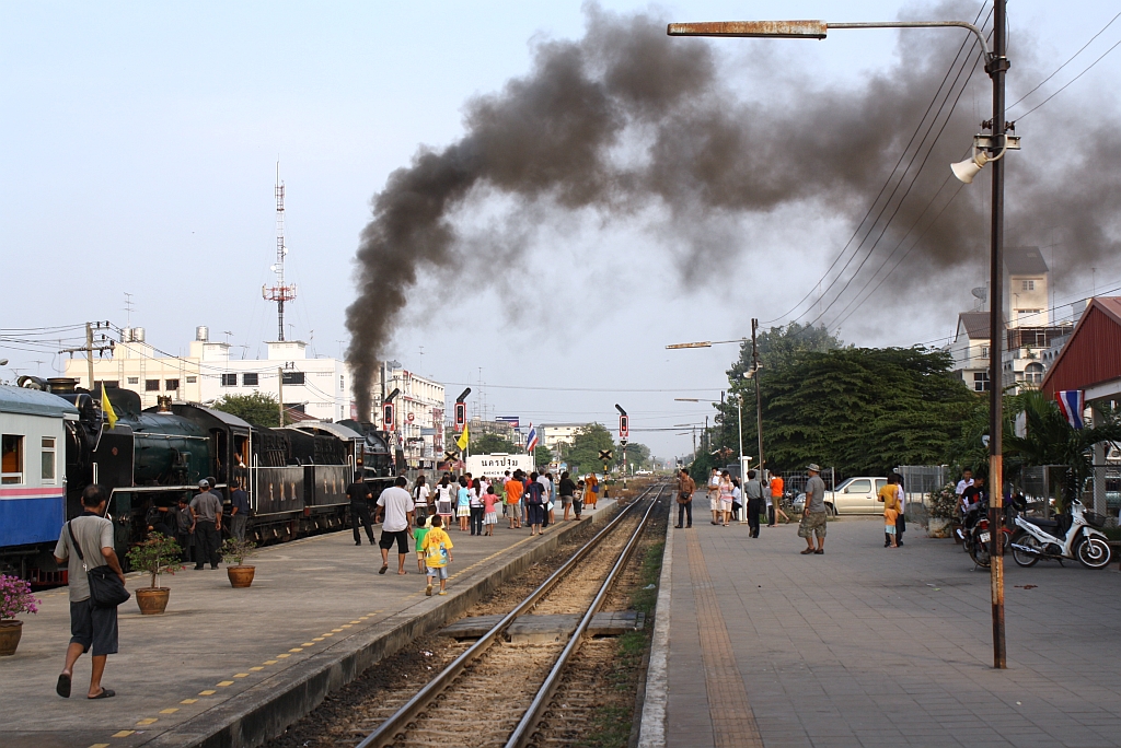 Hoch steig die Rauchfahne der 824 in den Himmel; 824 und 850 mit dem Dampfsonderzug 9002 nach Bangkok im Bf. Nakhon Pathom am 06.Dezember 2010.