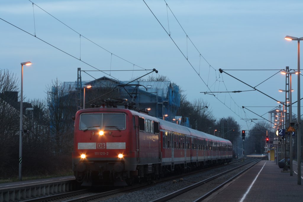 Eine E-Lok der Baureihe 111 hat am 04.02.2011 einen VT 628 am Hagen in Lehrte.