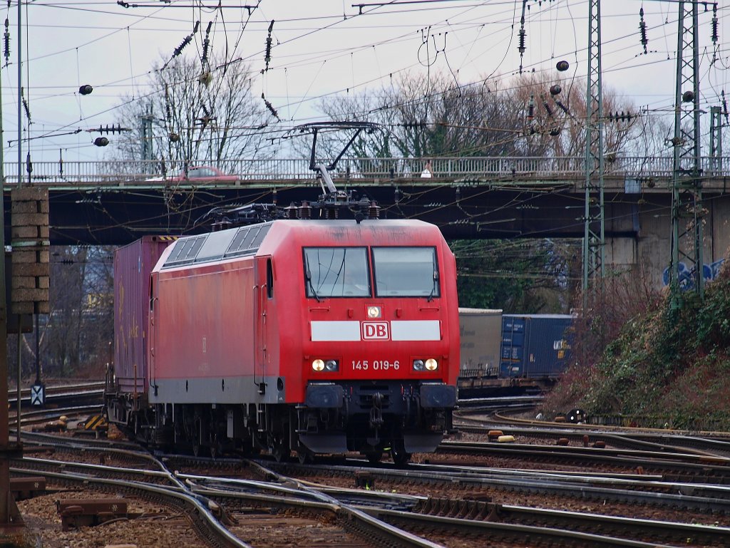 145 019-6 kommt am 13.02.2011 mit einem Containerzug unter der Brücke Turmstrasse nach Aachen West.