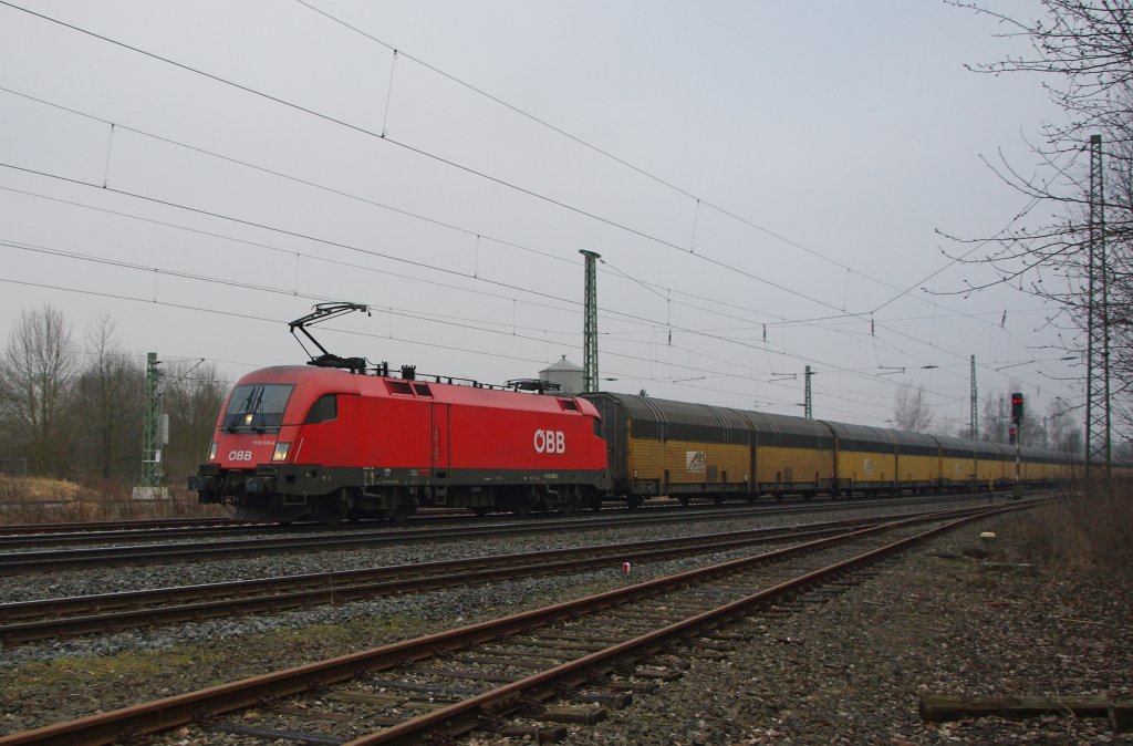 ÖBB 1116 239-3 mit ARS-Autozug Zug in Fahrtrichtung Norden. Aufgenommen am 01.02.2011 in Eschwege West.