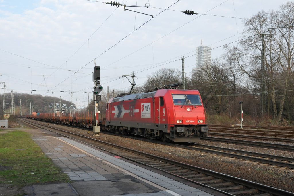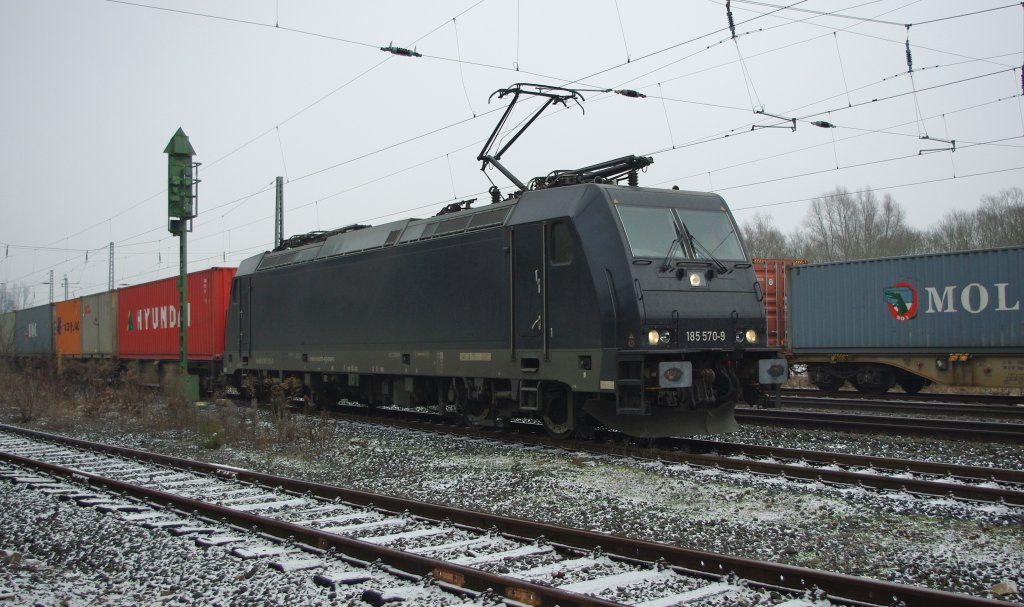 185 570-9 kann nach einem Signalhalt in Eschwege West die Fahrt mit ihrem Containerzug in Richtung Süden wieder aufnehmen. Aufgenommen am 02.02.2011.