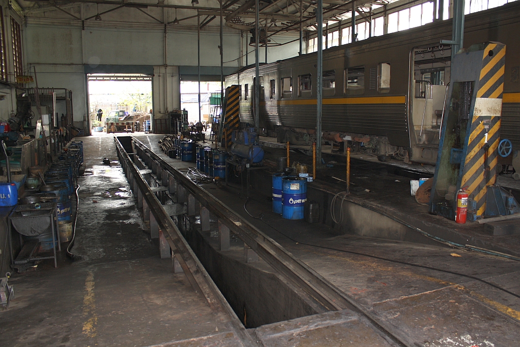 Blick in die Halle des Depot Mahachai am 07.Dezember 2010. Rechts der drehgestelllose Triebwagen 1255 auf den Hebeböcken.