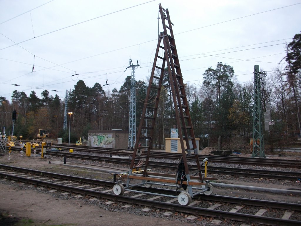Warum extra einen 708 oder 711 kommen lassen,wenn sich Diese rollfähige Leiter zu Arbeiten an der Fahrleitung auch eignet.Aufnahme am 13.November 2010 in Binz.