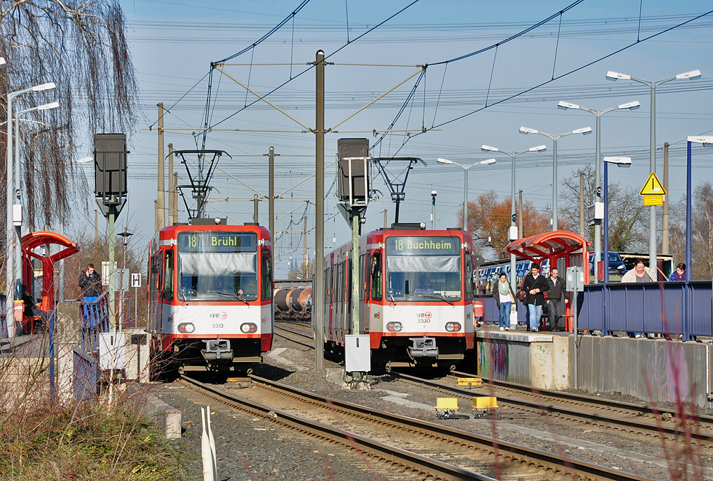 Straßenbahn der Linie 18 (KVB) an der Haltestelle Brühl-Vochem in beide Richtungen (Köln und Bonn) - 07.02.2011