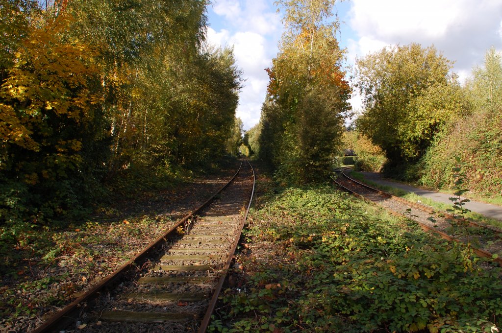 Das sind die kläglichen Überreste der ehemaligen Strecke von Stolberg/Rhld. nach Mönchengladbach (KBS 482). Das linke Gleis ist der Rest von Geneicken nach Mönchengladbach. Heute endet das Gleis auf dem Gelände des Kabelwerkes ,da der Bahnhof Geneicken nicht mehr existiert und das linke Gleis geht in das Werksgelände der Firma Ariva, die Transformatoren herstellen und die über diese Gleise abgefahren werden. 24.10.2010