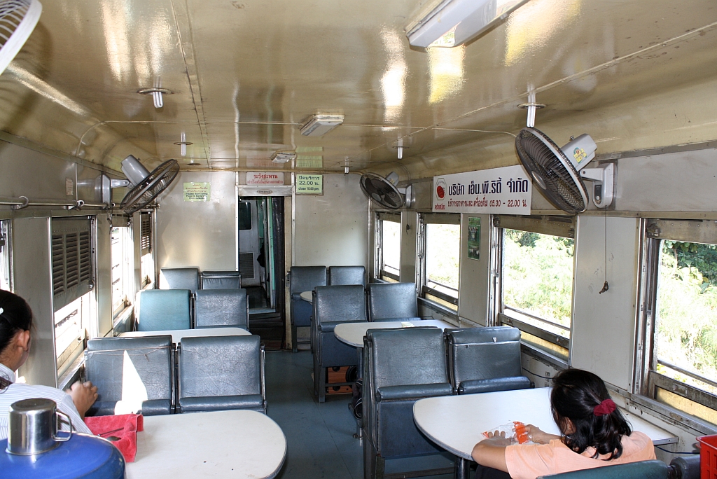 Innenansicht des บกข.1013 (บกข. =BRC./Bogie Buffet Carriage, Bogie Restaurant Car), aufgenommen am 06.Jänner 2011 während des Haltes des EXP 52 im Bf. Tha Chomphu.