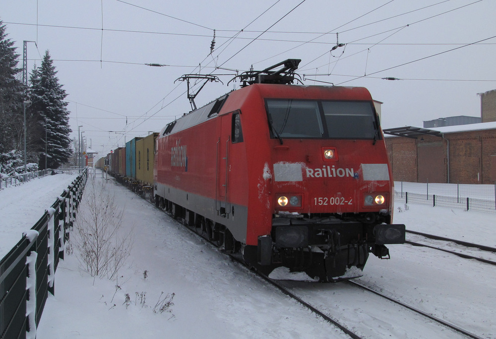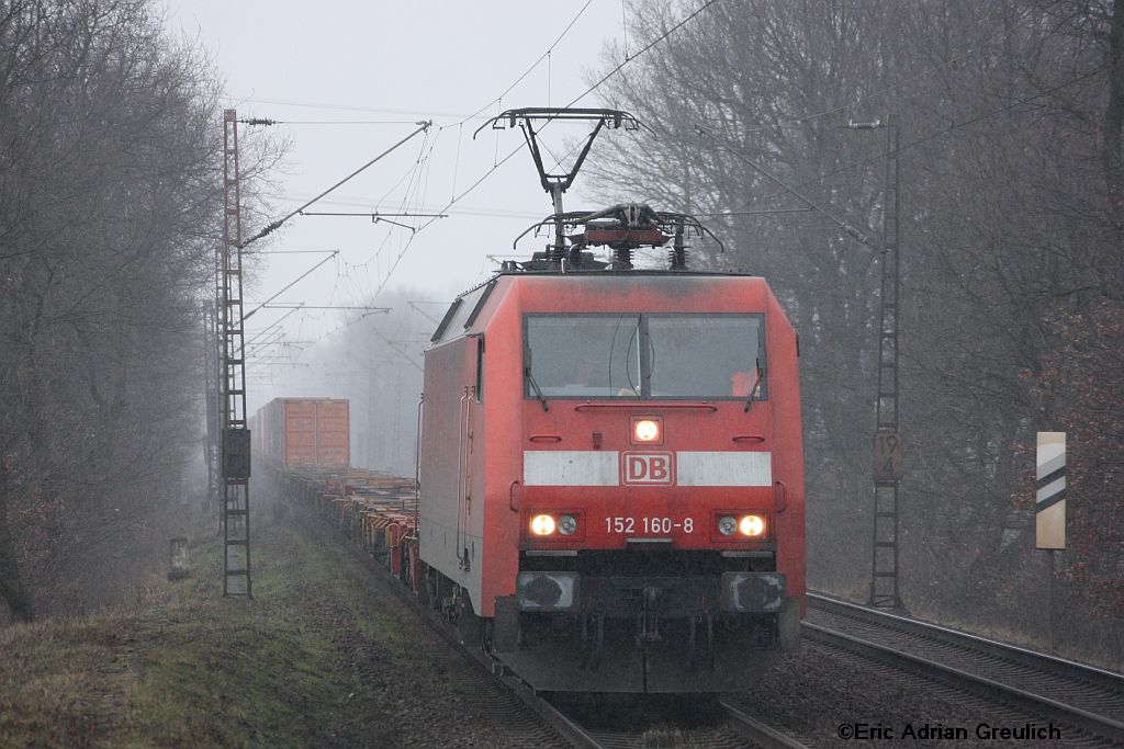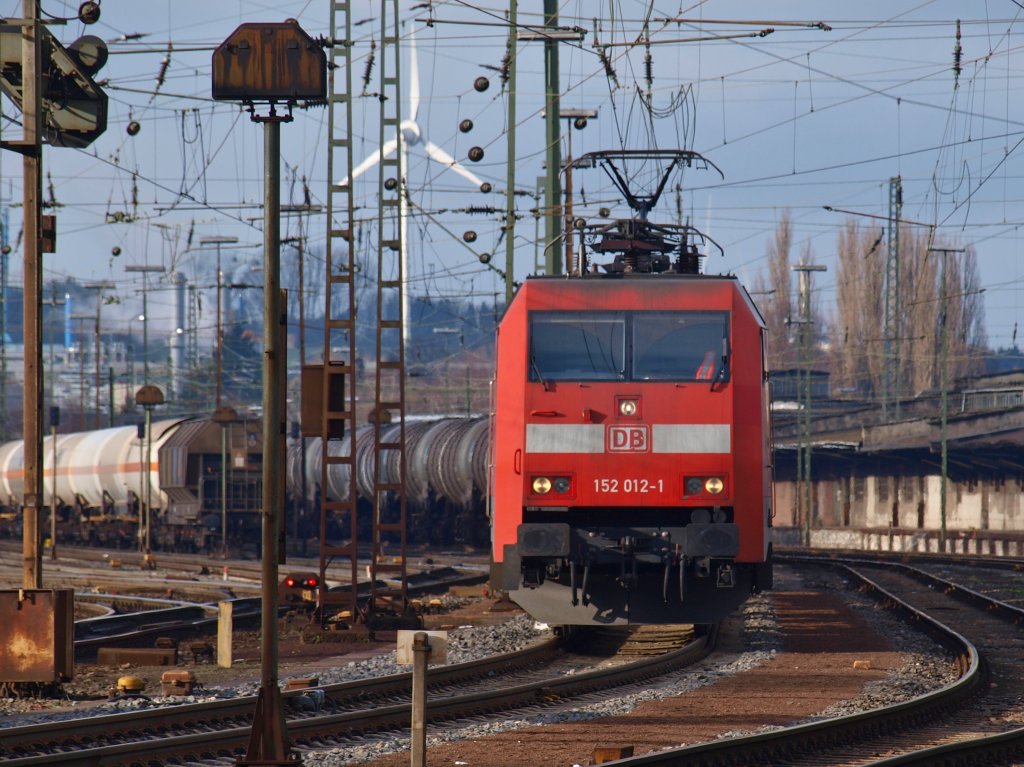 Vor einem mit Diesel beladenen Kesselzug steht 152 012-1 am 20.01.2011 in Aachen West und wartet auf grünes Signal um Richtung Köln zu fahren.
