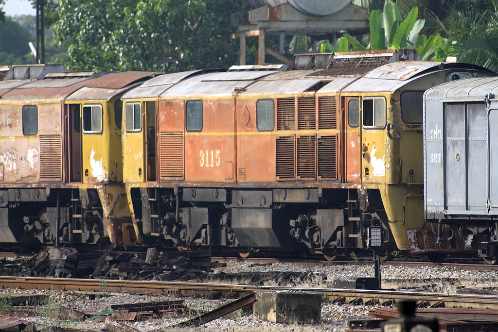 3115 (Krupp, Bj.1969, Fab.Nr. 5004) abgestellt im Bf. Hat Yai Junction am 28.Oktober 2010. Zum Aufnahmezeitpunkt waren alle 31xx des Depot Hat Yai wegen Ersatzteilmangels abgestellt bzw. schon ausgemustert.