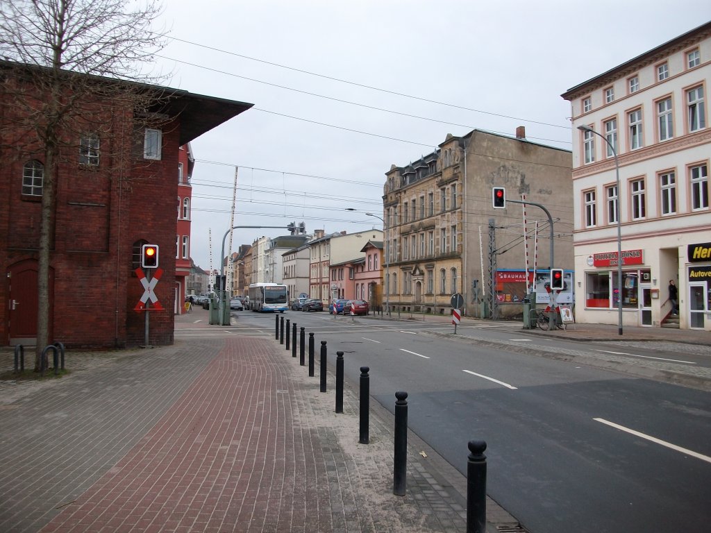 Bahnübergang Tribseer Damm Richtung Zentrum in Stralsund am 18.Januar 2011.Viele Jahre war dieser Bahnübergang neben dem Rügendamm ein Nadelöhr,da es hier manchmal eine Ewigkeit dauerte bis die Schranken wieder geöffnet wurden und die Autos sich kilometerlang stauten,bis die letzten Autos über den Überweg waren,waren die Schranken schon wieder geschlossen.Wir Einheimischen versuchten schon immer über Schleichwege  diesen Bahnübergang zuvermeiden.