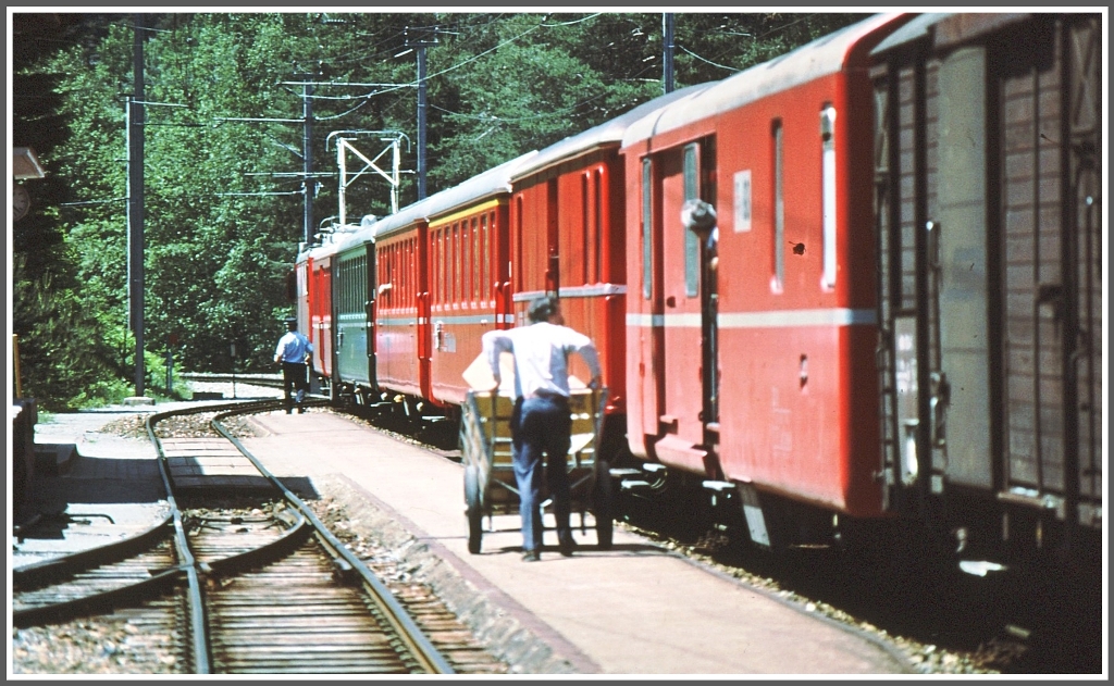 Das gescannte Dia ist zwar nicht eben scharf, trotzdem möchte ich diese Szenerie hier zeigen, vermittelt sie doch einen Eindruck, wie es Anfangs der neunziger Jahre bei der RhB aussah. Postempfang und Versand mit Postwagen wie hier in Versam-Safien gibts bei der RhB schon lange nicht mehr. Grüne Einheitswagen und Stückgut oder Alpviehwagen sind auch passé. (Archiv ca. 1990)