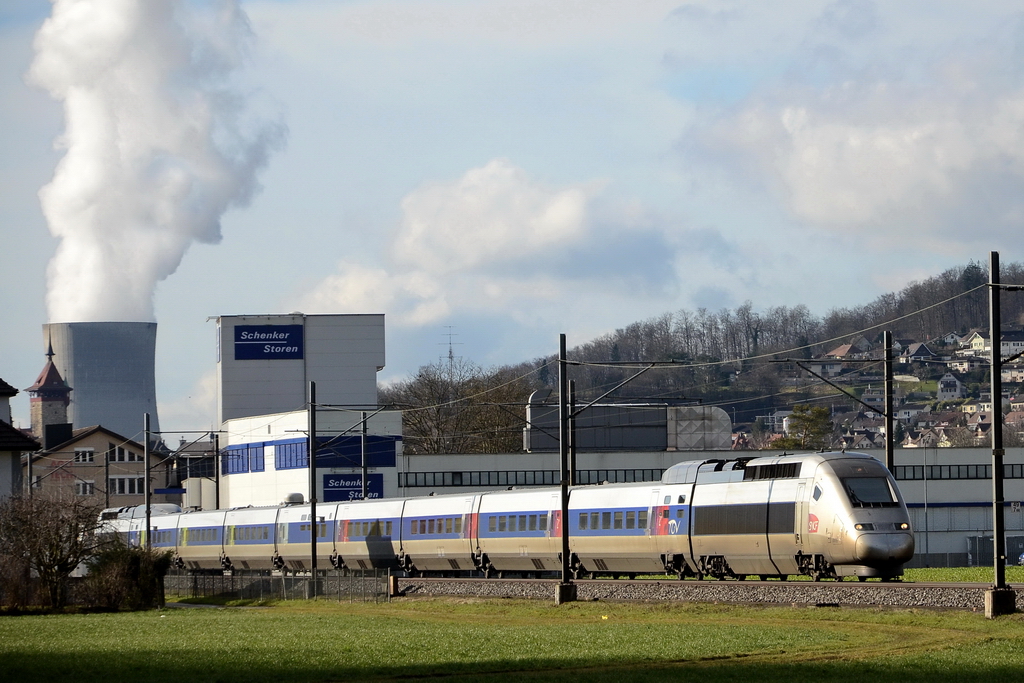 Der TGV 4416 zwischen Olten und Aarau in Richtung Zürich. Links im Hintergrund der Kühlturm vom KKW Niedergösgen. 15.1.2011