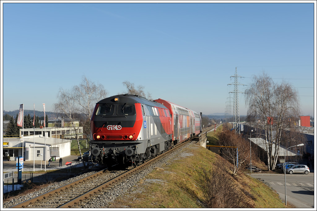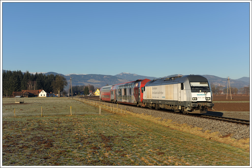 ER 20-2007 "Schneewittchen" bespannnte am 18.1.2011 R 8557 (S61) von Graz über Lieboch nach Wies-Eibiswald. Die Aufnahme entstand kurz nach der Haltestelle St. Peter im Sulmtal. R 8557 ist der einzige Zug, der zur Zeit über die "alte" Strecke geführt wird, und bei Tageslicht fotografierbar ist. Er er verkehrt bis Lieboch gemeinsam mit 8405 nach Köflach.