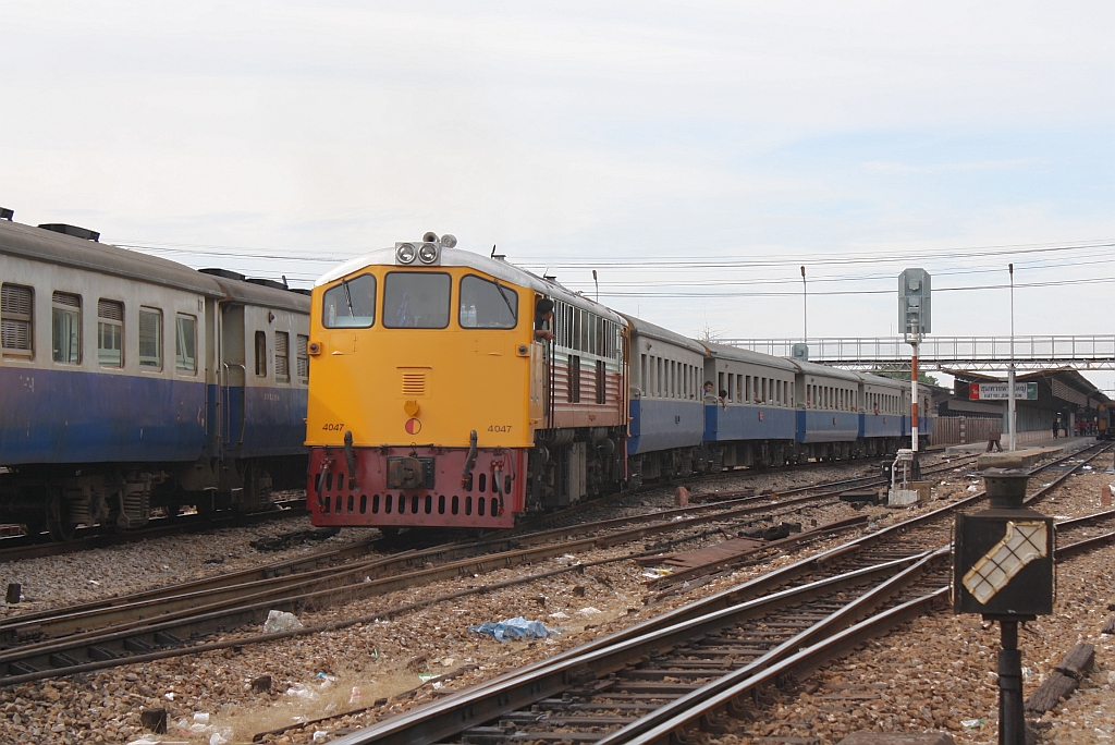 GEK 4047 (Co'Co', de, General Electric, Bj.1966, Fab.Nr. 35953)fährt am 28.Oktober 2010 im Bf. Hat Yai Junction mit dem ORD 455 (Nakhon Si Thammarat - Yala) von Gleis 3 aus.