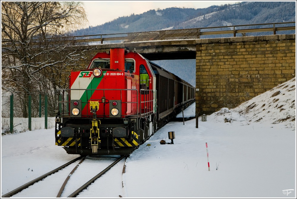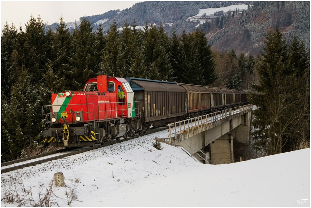 Gmeinder Diesellok D4 der STLB fährt mit Zellstoffzug SGAG 93425 von Pöls nach St.Michael. Allerheiligen 20.1.2011